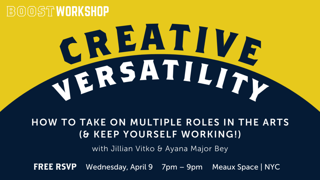 Join BOOST Co-Chairs, Jillian Vitko and Ayana Major Bey, in a workshop about how to succeed as a versatile and multi-hyphenate artist in today’s arts & entertainment industry (AKA how to keep yourself working as an artist!).